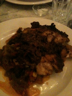 Main courses were less dazzling, but still pretty good. A fish stew of cod, octopus, red mullet and brown shrimp lacked a bit of oomph, despite its Vermentino and fennel. Chicken with a Persian pomegranate and walnut sauce proved a textural (though not a visual) delight, meltingly cooked with a slight crunch from the walnut. Alas, accompanying broad bean pods in tomato sauce were lukewarm and uninspiring.